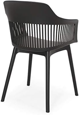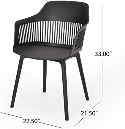 Why settle for a chair set that offers durability over style, or vice versa, when there is a set that offers both? Featuring weather-resistant properties and a unique plastic blend material, our outstanding outdoor chair set provides astonishingly stable frames that will last you for years to come. This minimalistic design balances clean-cut lines and elegant curves to create an impressive look of sturdy structure and stylish comfort. Finished with a modern vibe, our chair set is sure to transform any backyard space into a refined masterpiece. Includes: Two (2) Dining Chairs Material: Polypropylene Resin Color: Black Hand-Crafted Details Assembly Required Dimensions: 21. 50 inches deep x 22. 50 inches wide x 33. 00 inches high Seat Dimensions: 17. 50 inches deep x 18. 50 inches wide x 17. 50 inches high
