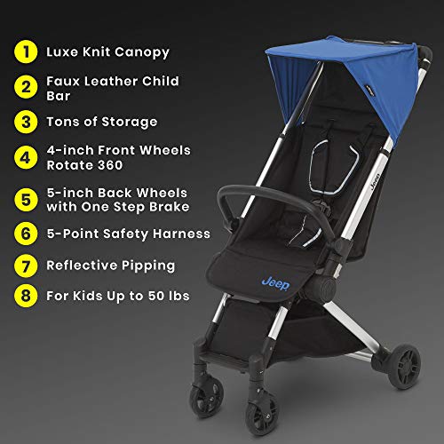 <Designed for the family on the move, the Jeep arrow travel stroller by Delta Children is extremely lightweight and ultra-compact when folded. Whether you’re exploring the local scenery or traveling overseas, the arrow is the ideal choice-itt easily fits in any plane or train overhead bin, or your car’s trunk. Plus, the stroller’s one-handed fold is the easiest ever! The included travel bag ensures your stroller stays in perfect shape during voyages or while stowed away at home. A convenient storage basket under the frame keeps all your travel essentials within reach. Expertly designed with high-end materials, this stroller features a lightweight, aluminum frame, knit canopy, faux leather child bar and reflective Pipping that makes taking nighttime walks safe. Its all wheel suspension, one-step footbrake and swivel-front wheels guarantee a smooth, stable ride on almost any terrain. since 1941, the Jeep brand has been a symbol of freedom and expression. Influenced by a love of the great outdoors, Jeep Kids products are created for little adventurers.