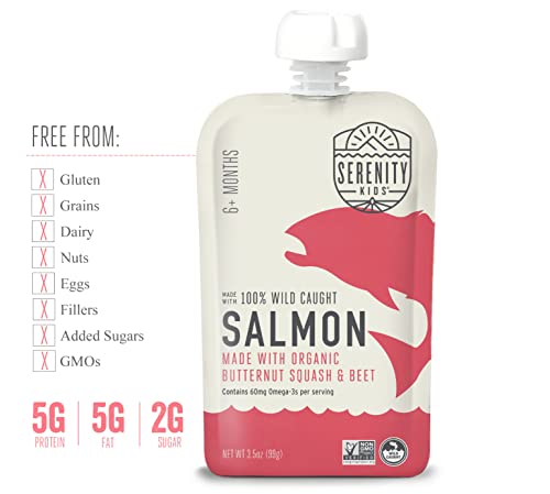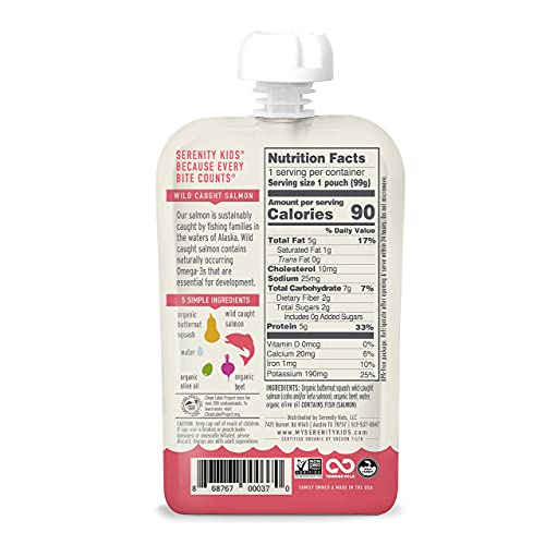 Serenity Kids 6+ Months Baby Food Pouches Puree Made With Ethically Sourced Meats & Organic Veggies | 3.5 Ounce BPA-Free Pouch | Wild Caught Salmon, Butternut Squash, Beet | 6 Count