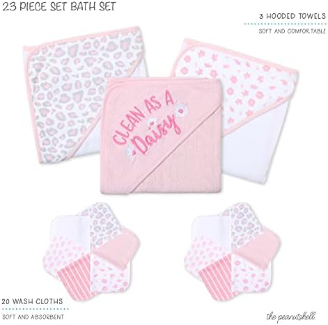 The Peanutshell Hooded Bath Towel and Wash Cloth Set for Baby Girls – 23 Piece Gift Set – Pink Floral & Cheetah Print