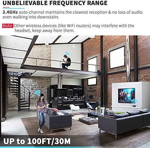 [TRULY NO STATIC 2.4GHz WIRELESS TECHNOLOGY]: 2.4GHz band transmission likes a car driving fast on an 8-lane highway without interference, allowing strong walls penetrability, little static sound and further wireless range, 100ft triple than the range of traditional Bluetooth headsets (33ft)! IF keeping losing signal, contact us for a re-pairing step.